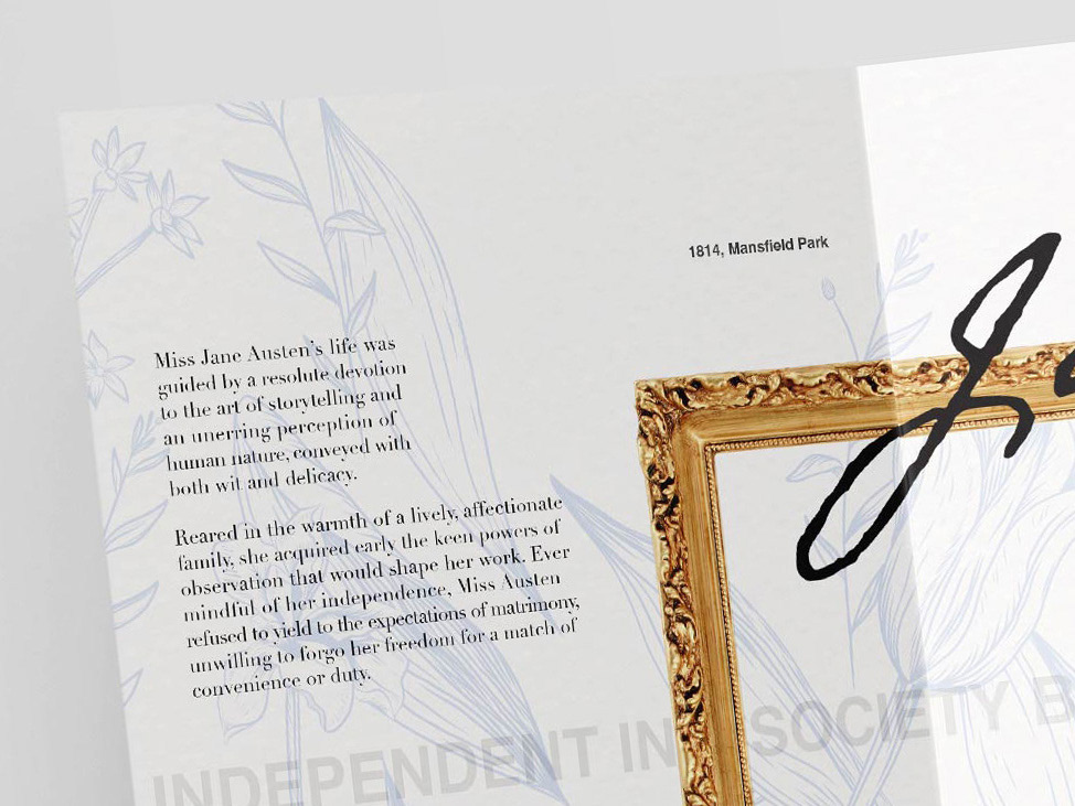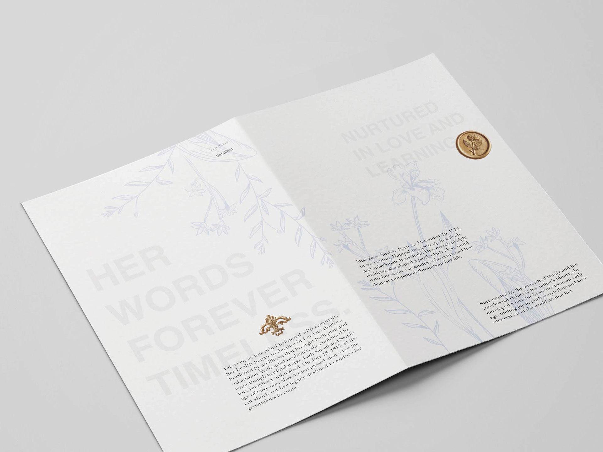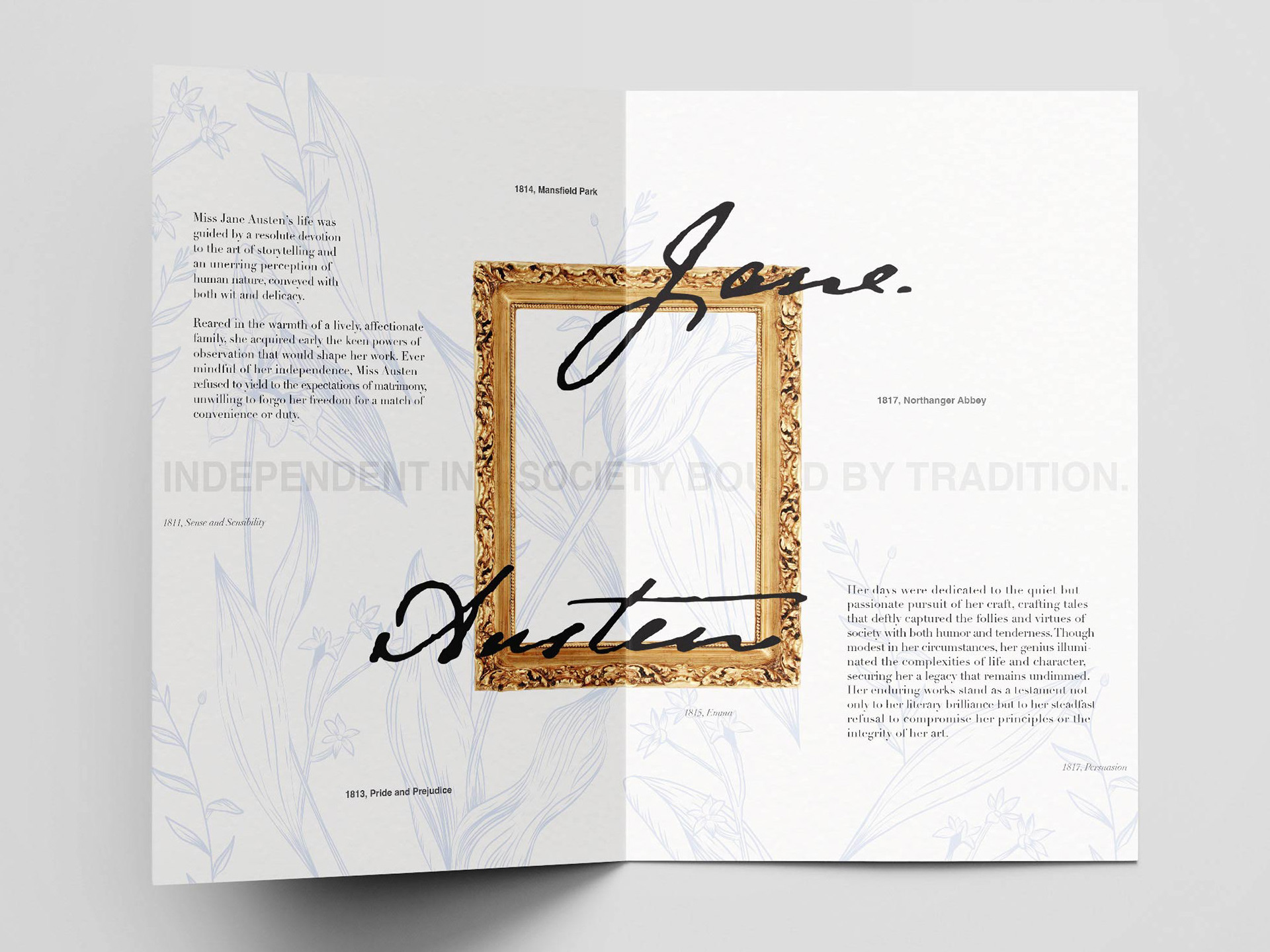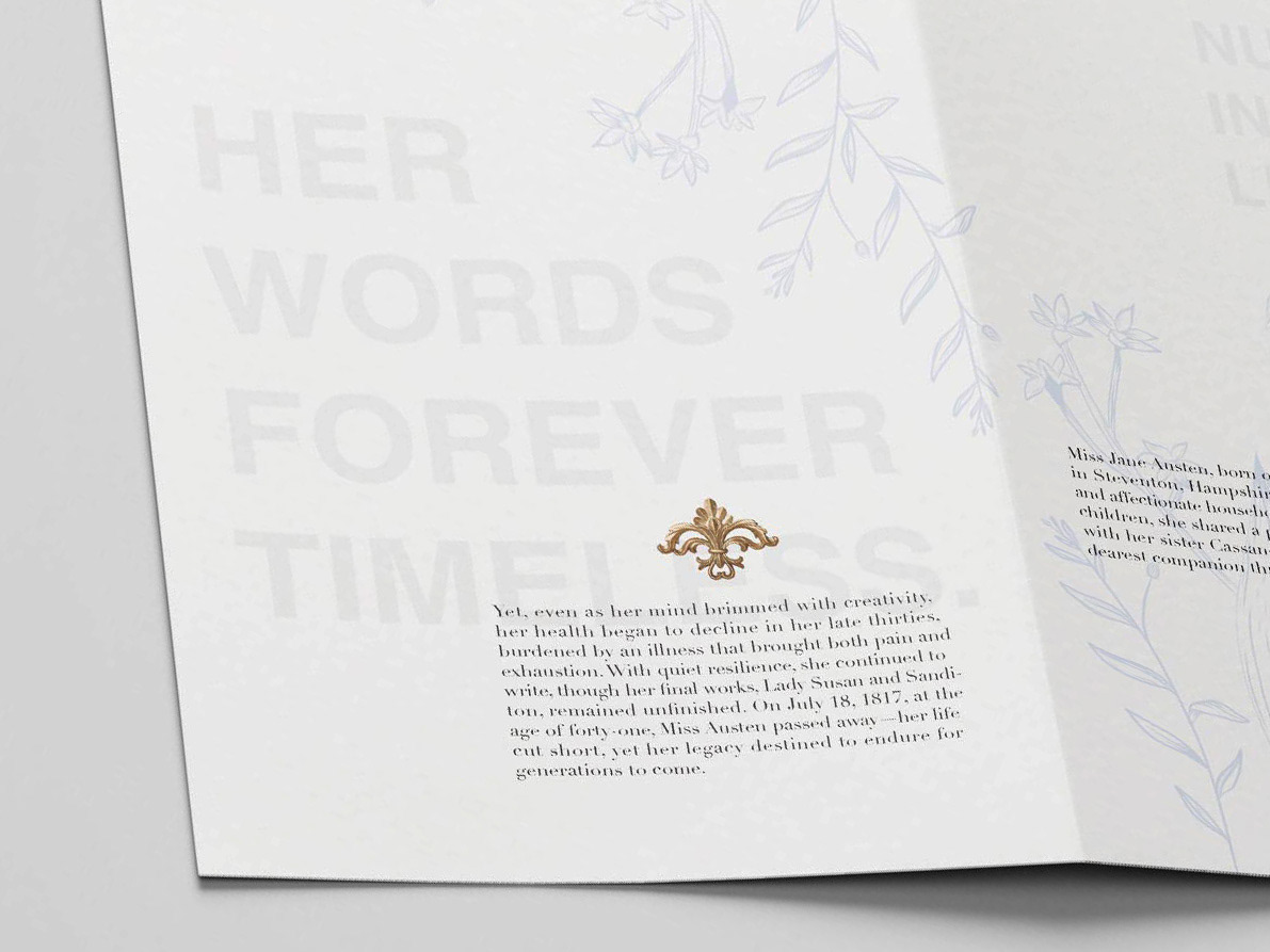 Jane Austen’s life and stories are full of wit, charm, and elegance. This bifold brings her world to life through thoughtful layout, typography, and visuals, capturing both the beauty and sophistication of her work.